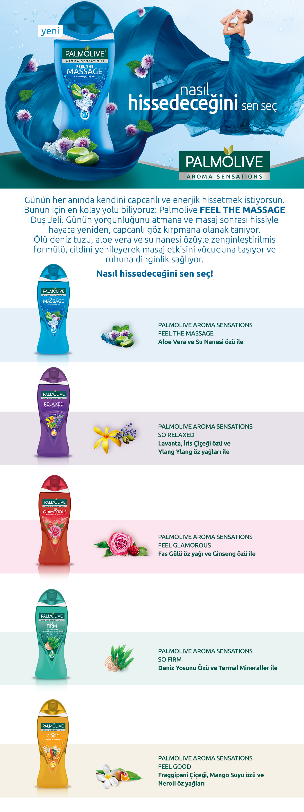 Palmolive Aroma Sensations Feel The Massage Banyo ve Duş Jeli ölü deniz mineralleriyle zenginleştirilmiştir. Cildinizi yumuşacık, pürüzsüz ve ışıl ışıl hissedin. Cildinizi ölü deri hücrelerinden arındırmaya yardımcı olan ölü deniz tuzu ve masaj yapıcı doğal tanecikler içerir. Nötr pH değerine sahiptir.